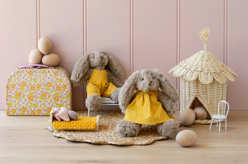 Mr & Mrs Honey Bunny are the perfect size to keep at home & snuggle up to in bed, whereas our smaller Baby Honey Bunnies are ideal to take out & about on adventures.